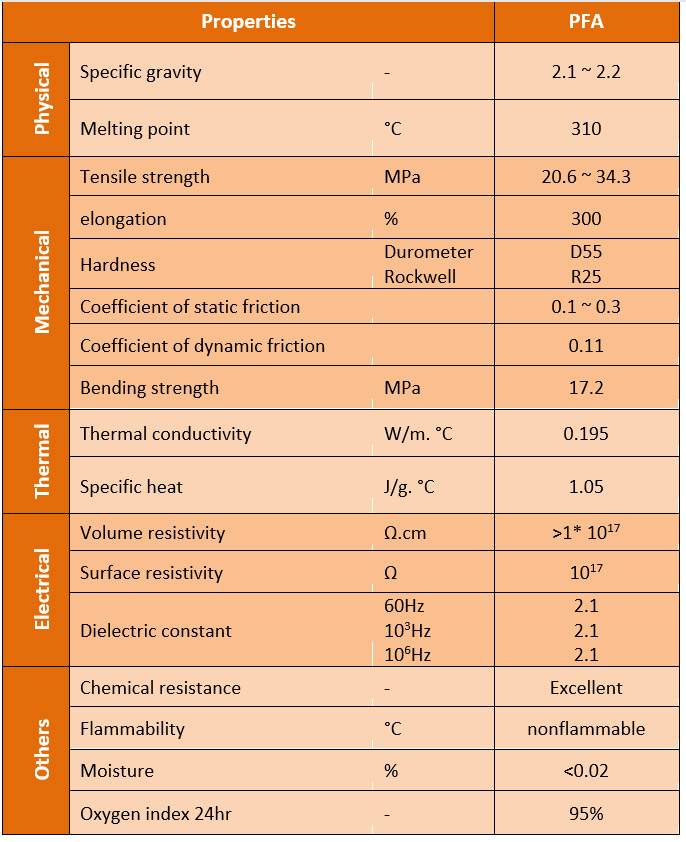 PFA (Perfluoroalkoxy) was developed in order to achieve a true melt-processable fluoropolymer. Its characteristics are such that in service it can be considered as interchangeable with PTFE in terms of its chemical service and temperature and pressure duty. It has the highest permeation performance of the fluoropolymers, exceeding that even of paste extruded PTFE. It also provides the smoothest and least wettable finish of all of the Fluoropolymer.